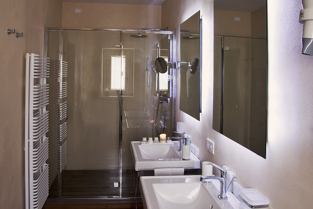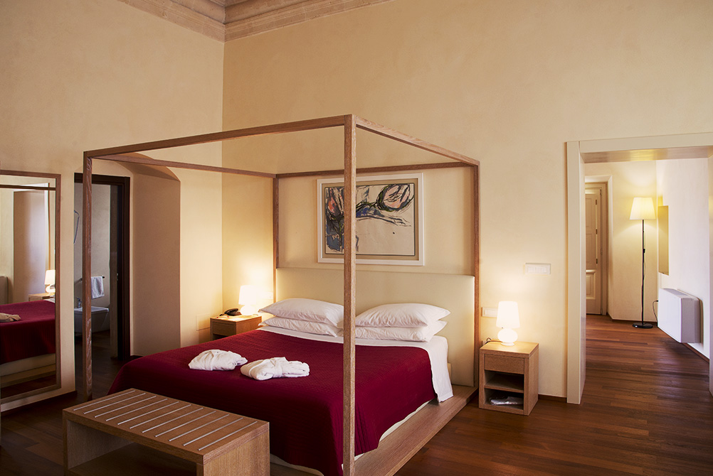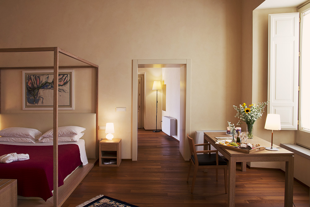 Una prima Suite è composta da tre ambienti, dove spicca maestoso un portale in pietra tufacea del Cinquecento, riportato al suo antico splendore. Nel bagno, la doccia è stata ricavata all'interno di una nicchia preesistente, offre i benefici della cromoterapia ed è rivestita da un micromosaico dalle nuances tortora.